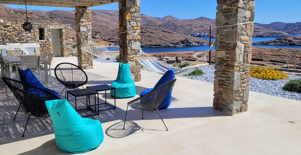 Il est des maisons dont on se souvient. L'arrivée déjà à Kythnos. Ce petit port qui semble ne pas avoir bougé depuis les années 50. Le trajet. Partir du port de Lavrio, prendre le bateau de Goutos Line; il est un peu plus long mais son pont en bois, ses cheminées fumantes, ses bancs devant la mer vous donnerons une impression des années 30. Arriver à Kythnos. Cette île qui n'a pas trop bougé. Les tavernes sur le port. Monter en haut, prendre les routes escarpées entre chèvres, murs de pierres caractéristiques de l'îles, les villages. Traverser l'île. Voir la mer, de l'autre côté du port. Commencer la descente et puis sur un petit chemin : vous couper le souffle avec cette vue. C'est là. Bienvenue dans la maison Ornis. Posée à flanc de montagne, elle vous offrira des lever de soleils extraordinaire. Des promesses de l'aube. La maison parfaite. La vue. Une immense terrasse où se prélasser, un grand salon salle à manger - 4 chambres avec chacune sa salle de bain. Et puis surtout quelque chose de rare : parce que la vue est parfaite mais la plage est juste en contrebas. A pied.